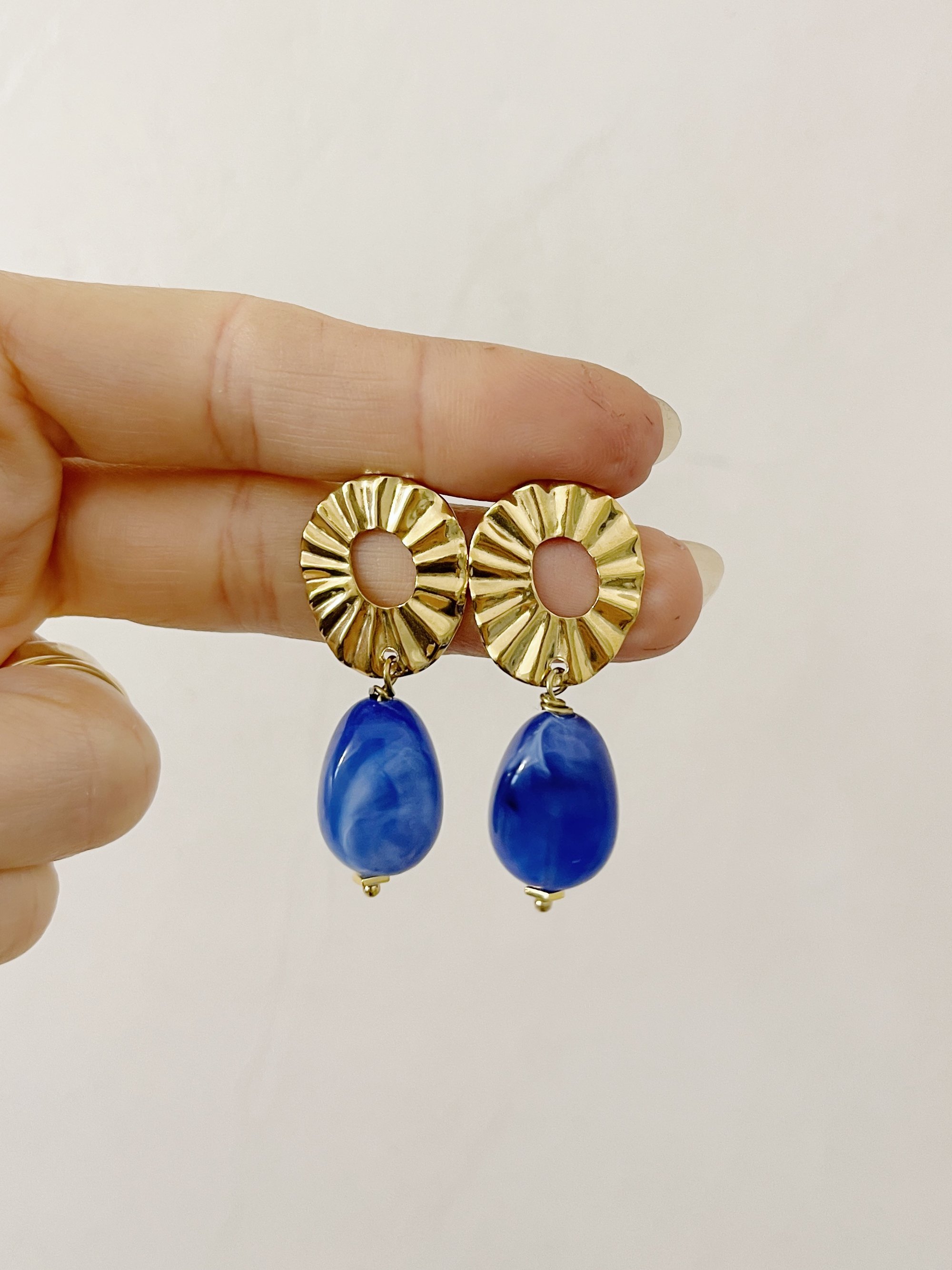 Les BO EDEN sont composées d'une monture tige en acier inoxydable doré et d'une perle en résine bleu.