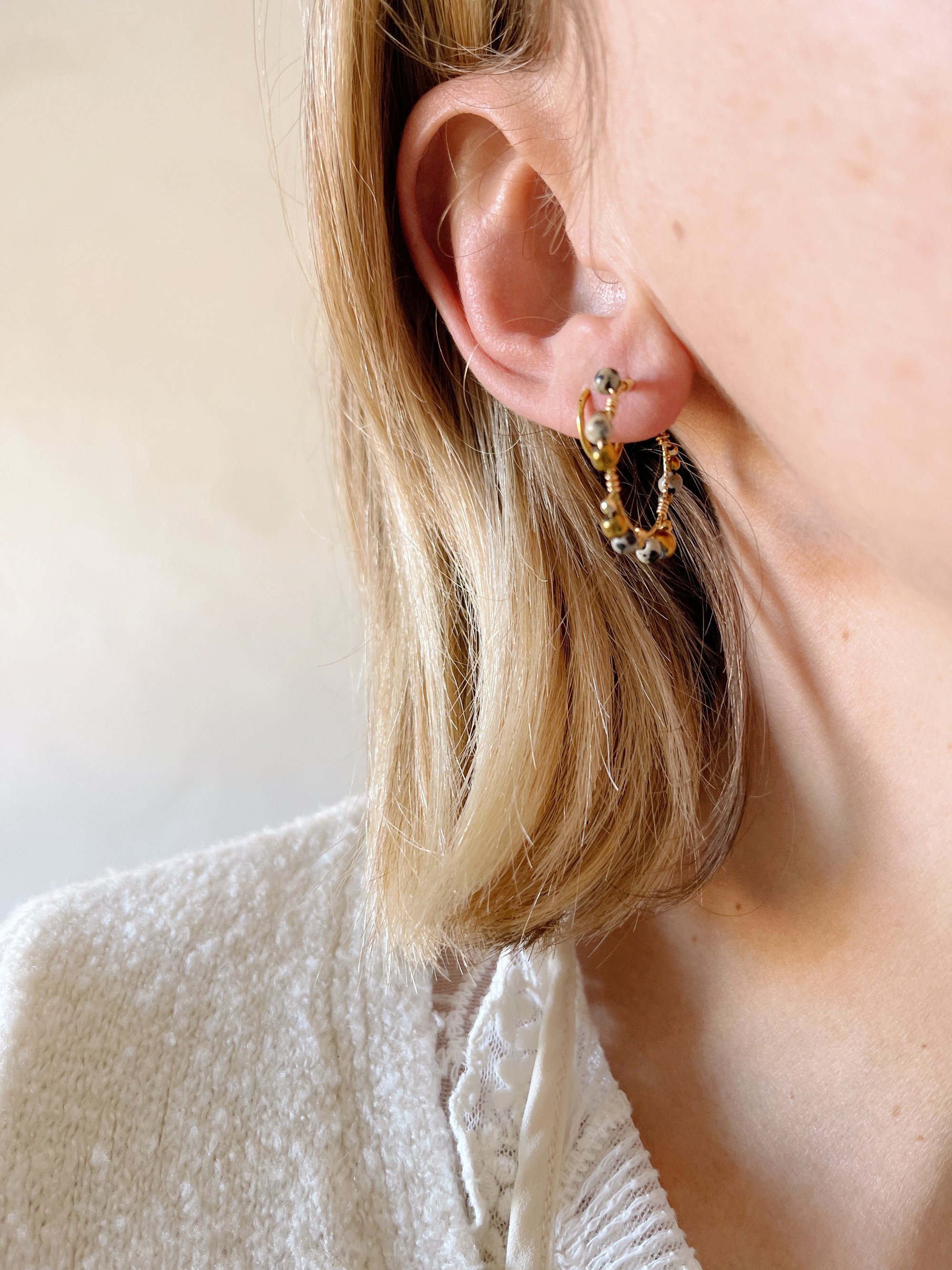 Les BO LISON sont composées d’une créole en acier inoxydable doré et brodées à la main de perles d’Améthyste, d’acier inoxydable doré et d’hematite doré