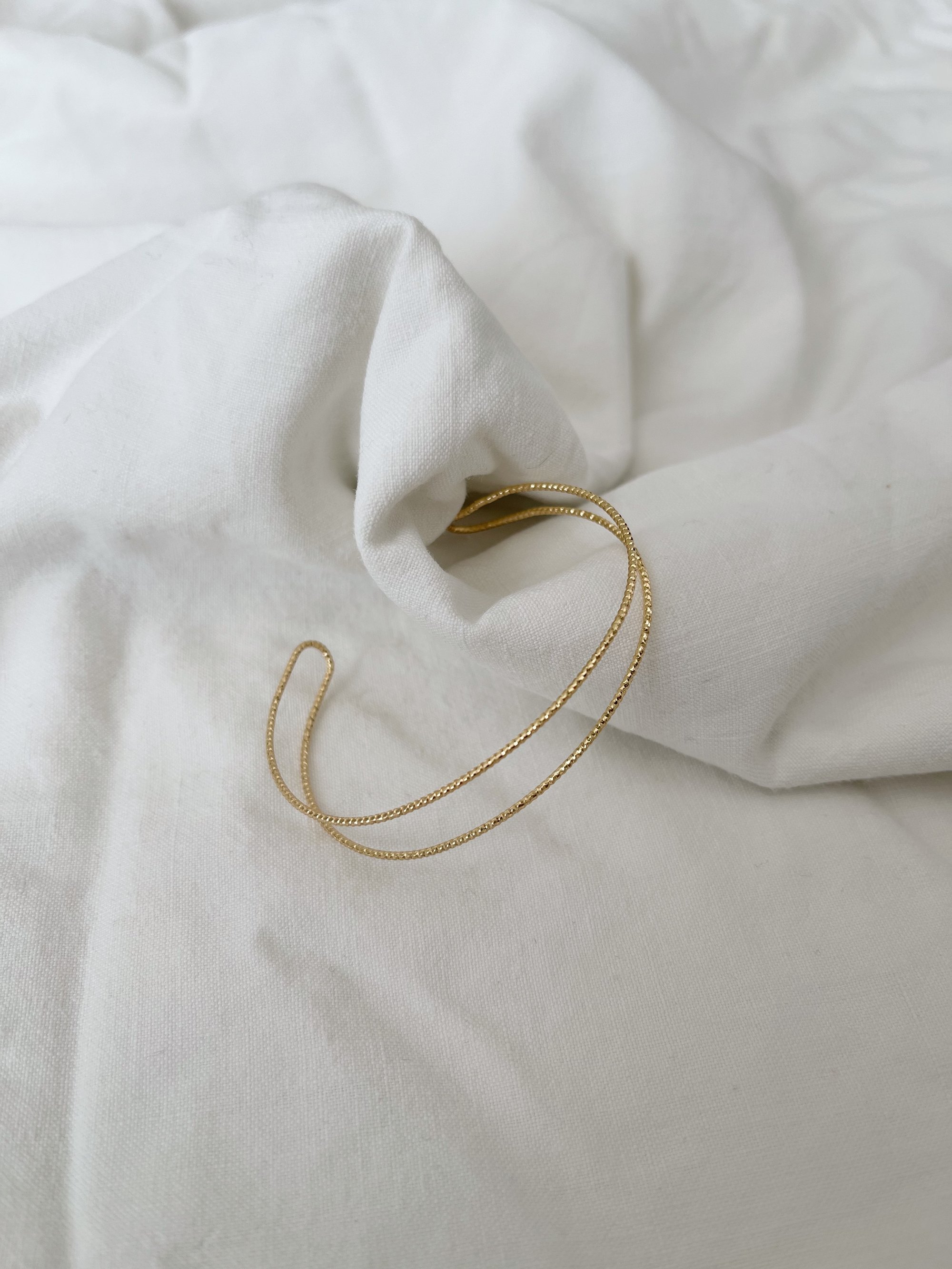 Le bracelet jonc double MILO est en laiton doré à l'or fin, Taille unique adaptable aux poignets fins à moyens.