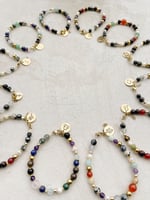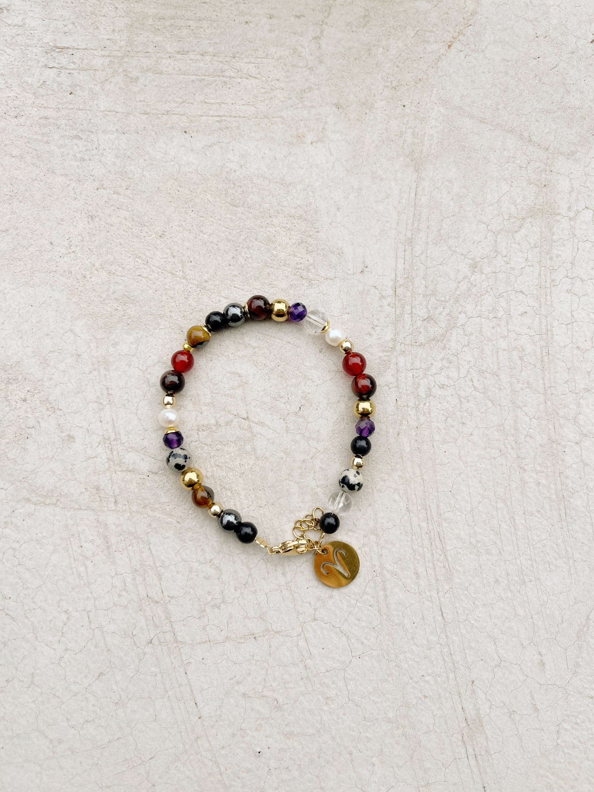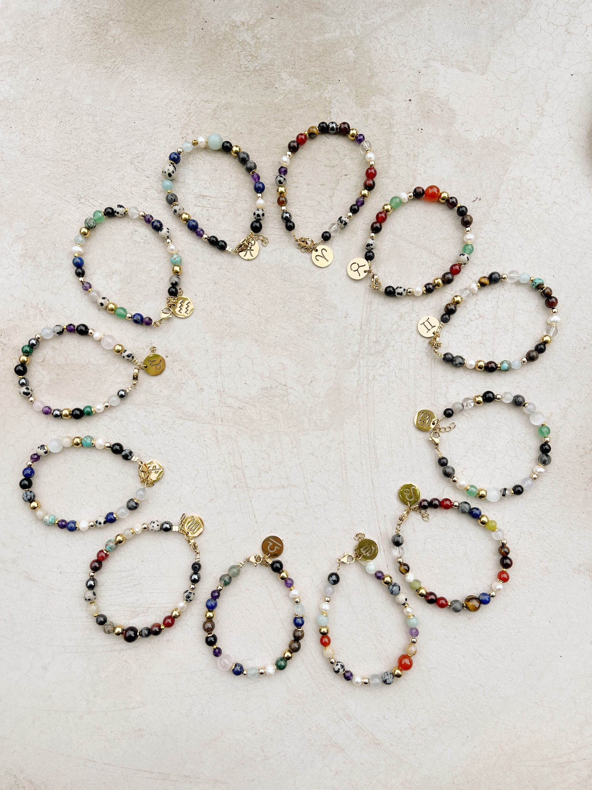 Le bracelet ZODIAQUE est composé de perles de pierres de gemmes spécialement sélectionnées pour chaque signe du zodiaque et de perles d'eau douce et de nacre, réhaussé de perles d'acier inoxydable.