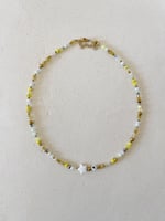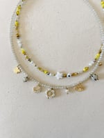Le collier EYE est composé d’une multitudes de perles en verre neuves et vintages, dans un camaïeu de jaune, j’y ajoute également quelques perles en pierre de gemme (citrine et quartz neige) Elles sont rehaussées par des perles en hématite et acier inoxydable dorées et grises.