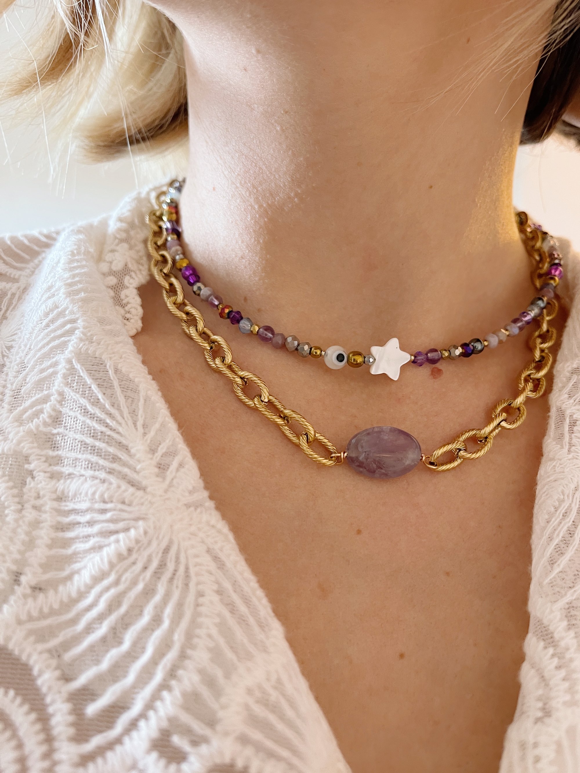 Le collier OROS est composé d’une chaîne maillons ovales travaillés en acier inoxydable et d’une pierre véritable d’Amethyste foncée (nuances de mauve et gris)