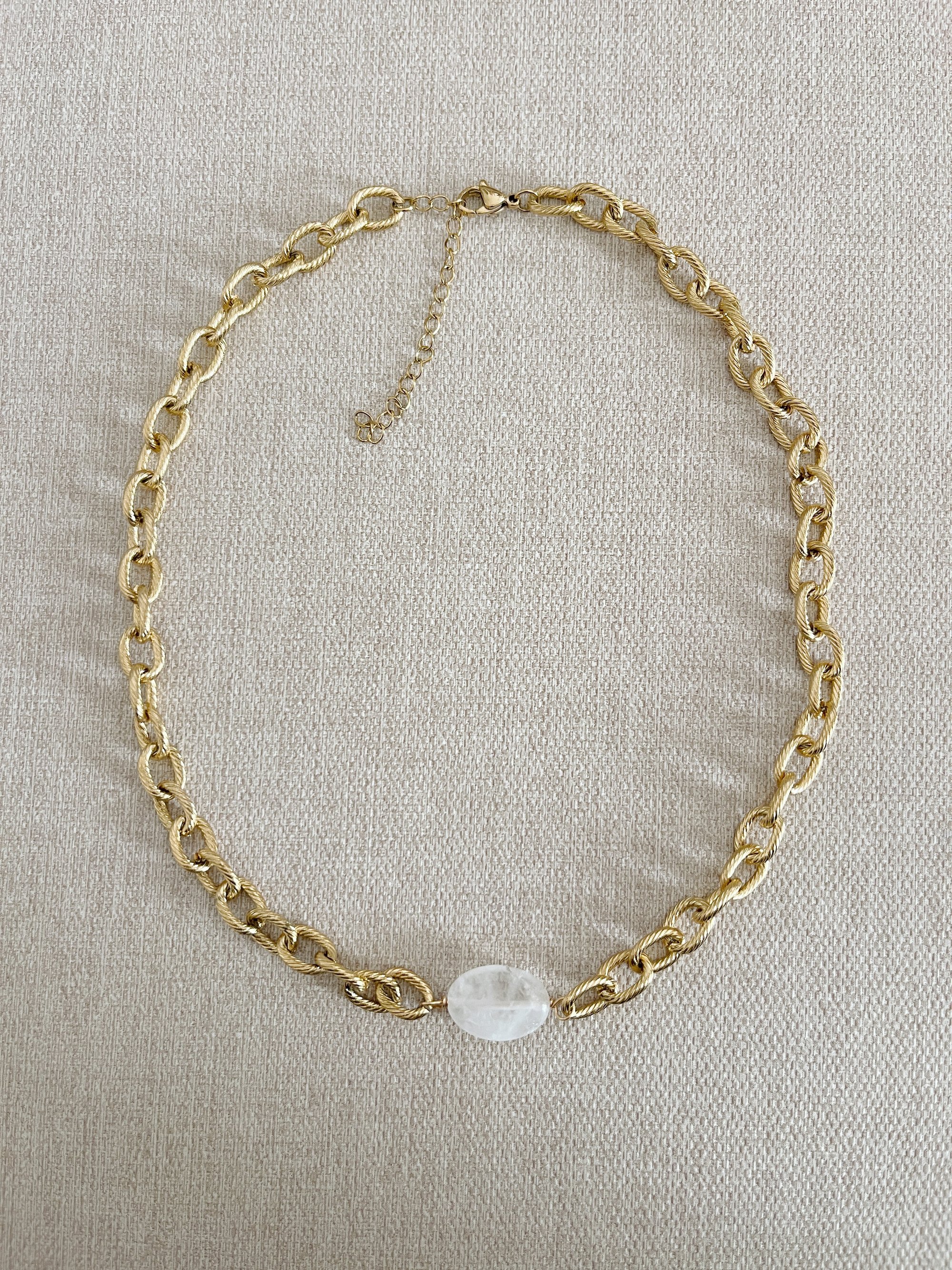 Le collier OROS est composé d’une chaîne maillons ovales travaillés en acier inoxydable et d’une pierre véritable de Quartz nuage