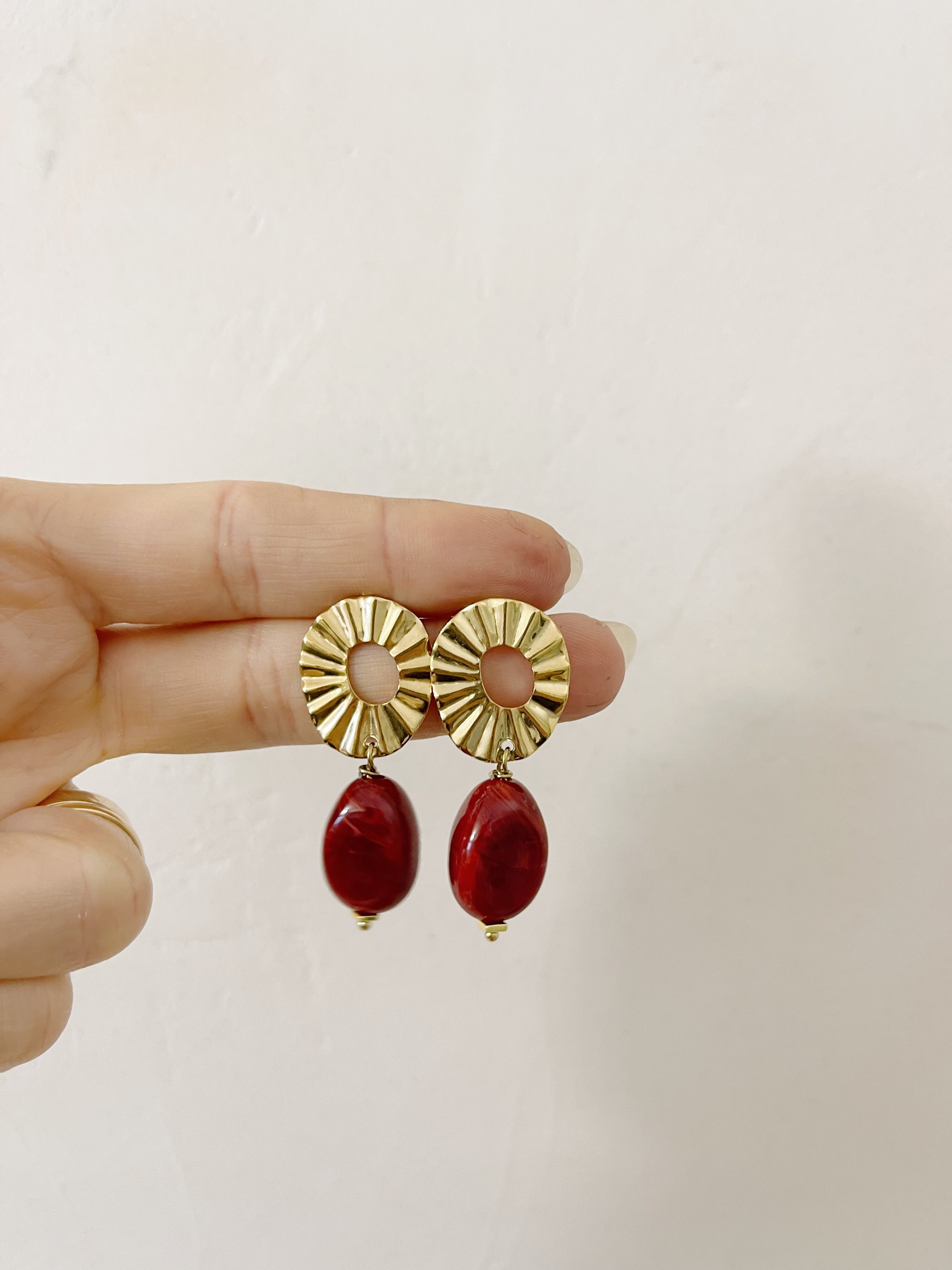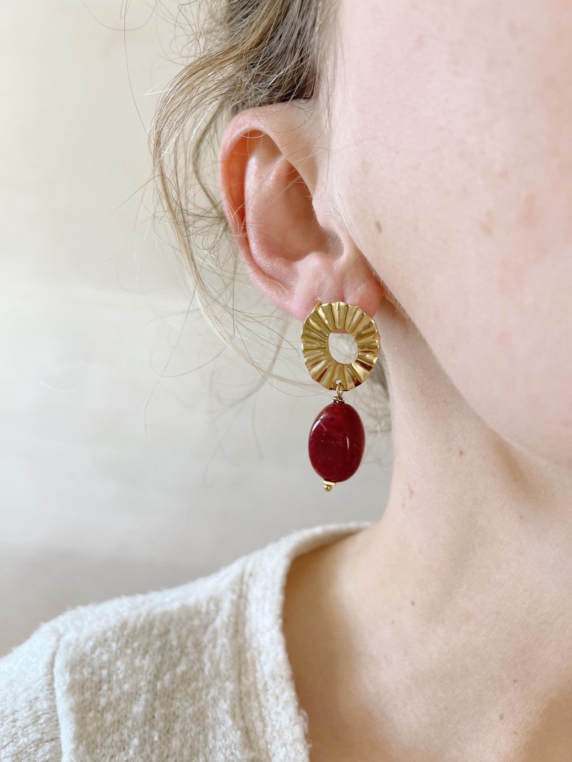 Les BO EDEN sont composées d'une monture tige en acier inoxydable doré et d'une perle en résine Bordeaux