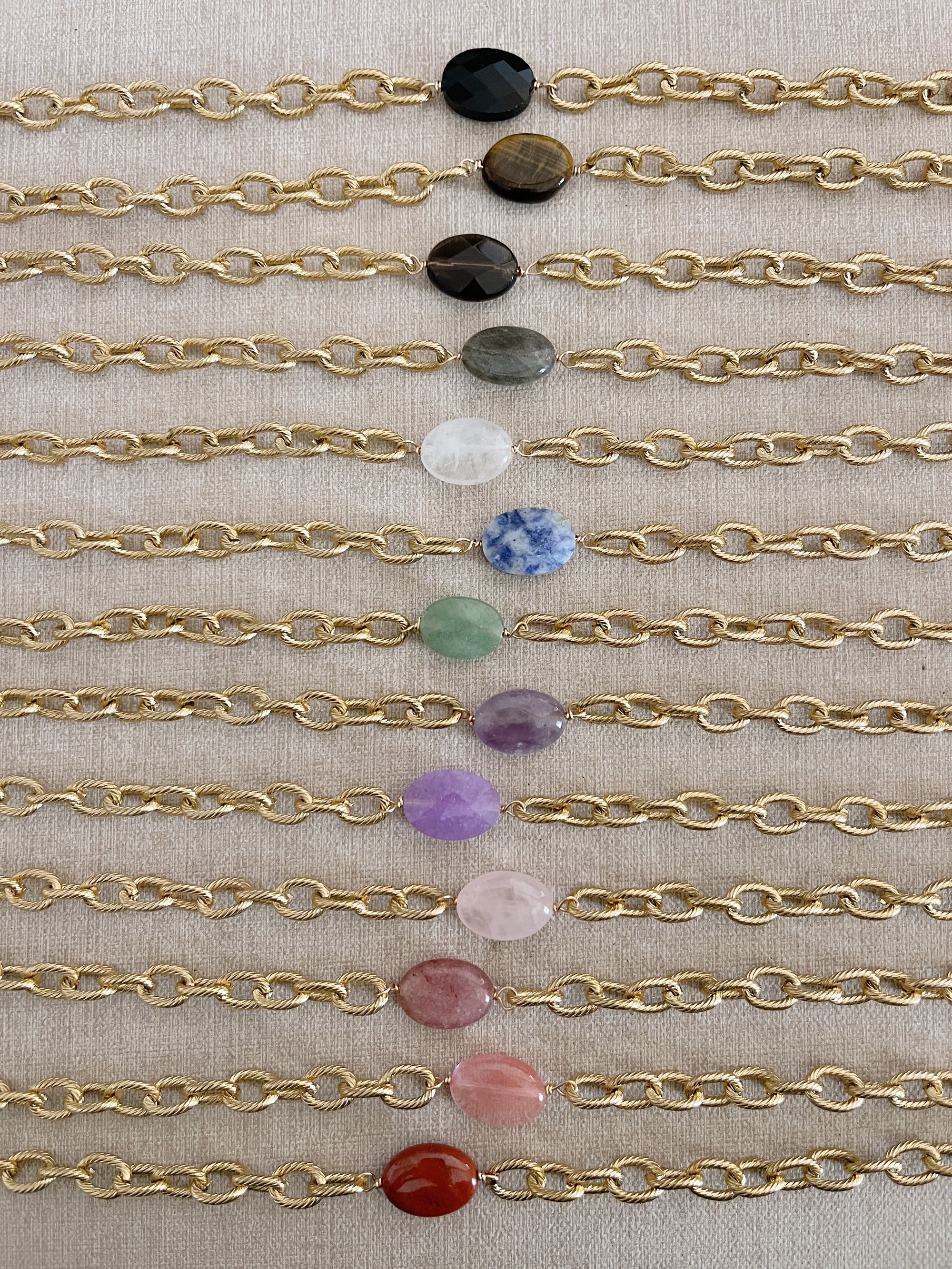 Le collier OROS est composé d’une chaîne maillons ovales travaillés en acier inoxydable et d’une pierre véritable d’Aventurine