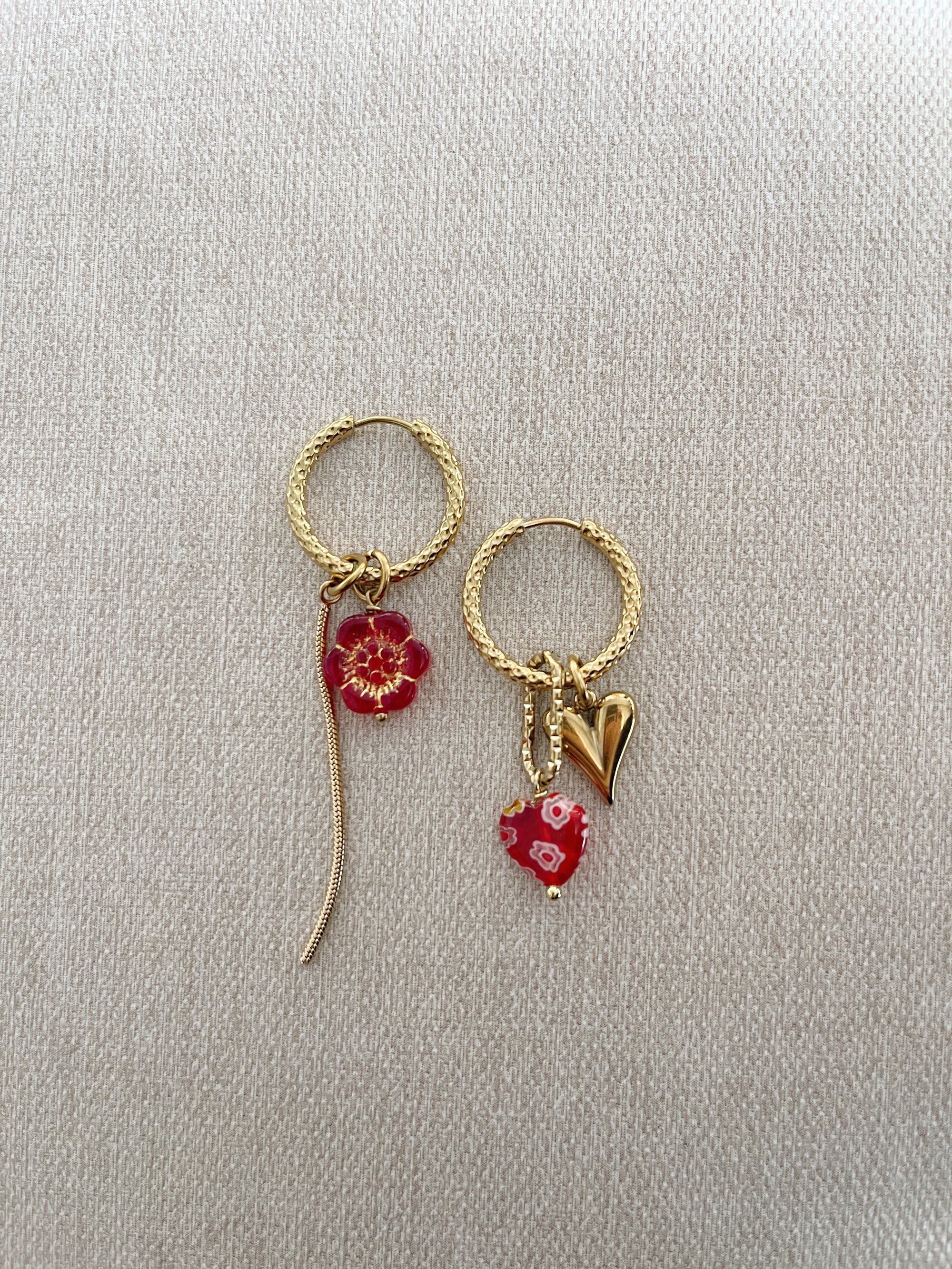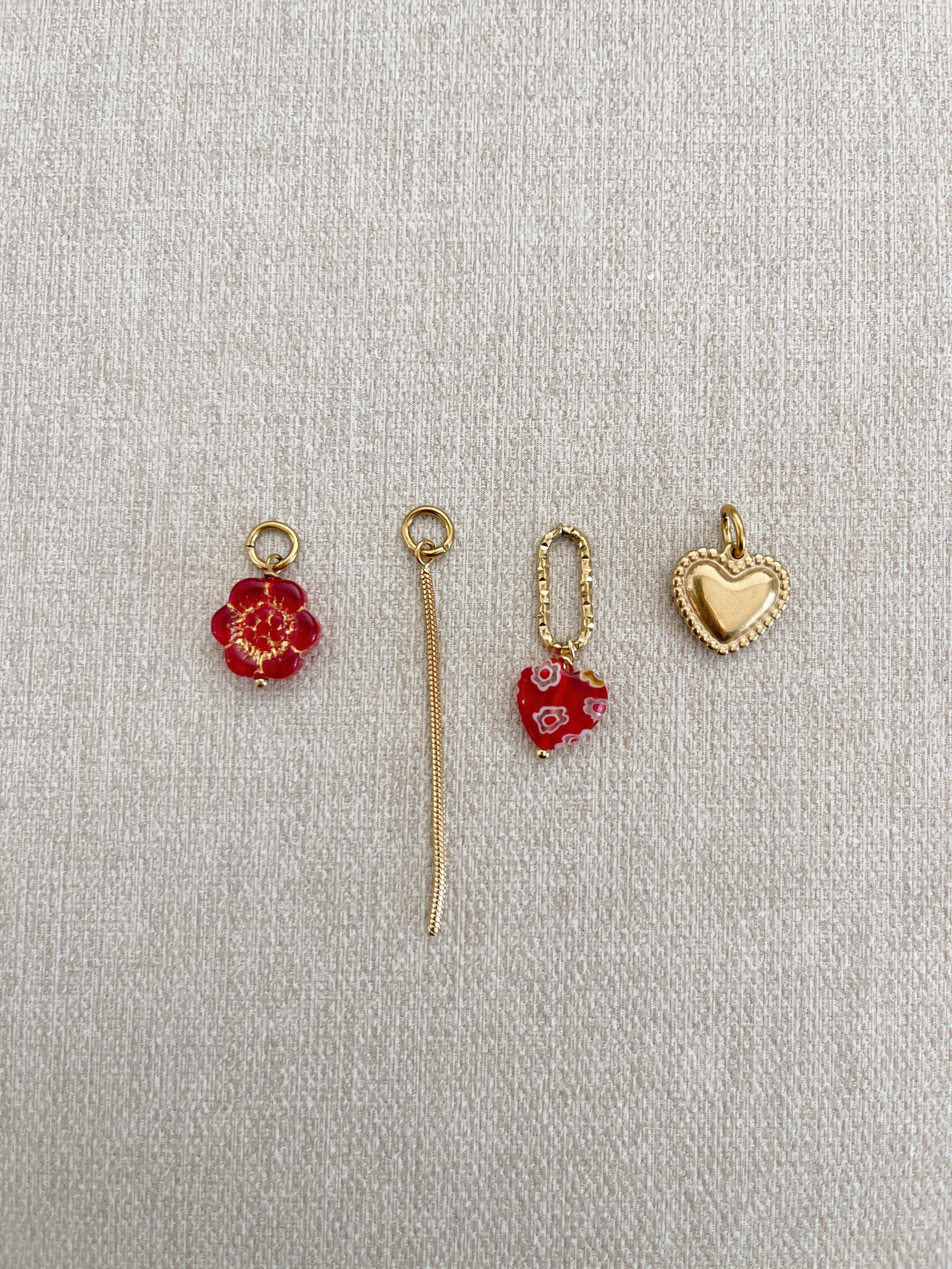 Quatre CHARMS assortis à enfiler sur une base de créole ! Fini le casse tête, une compo toute prête dans les tons de rouge