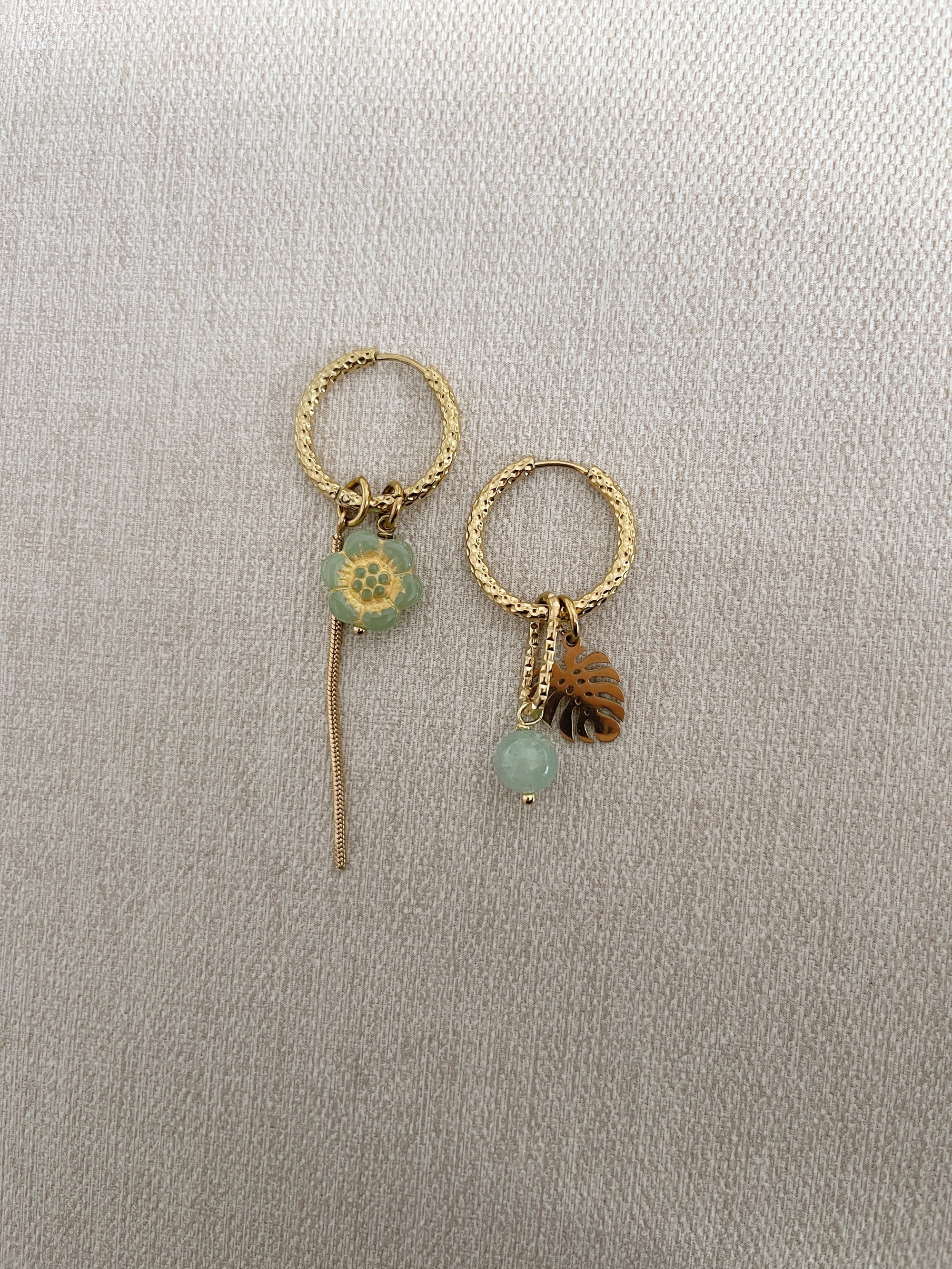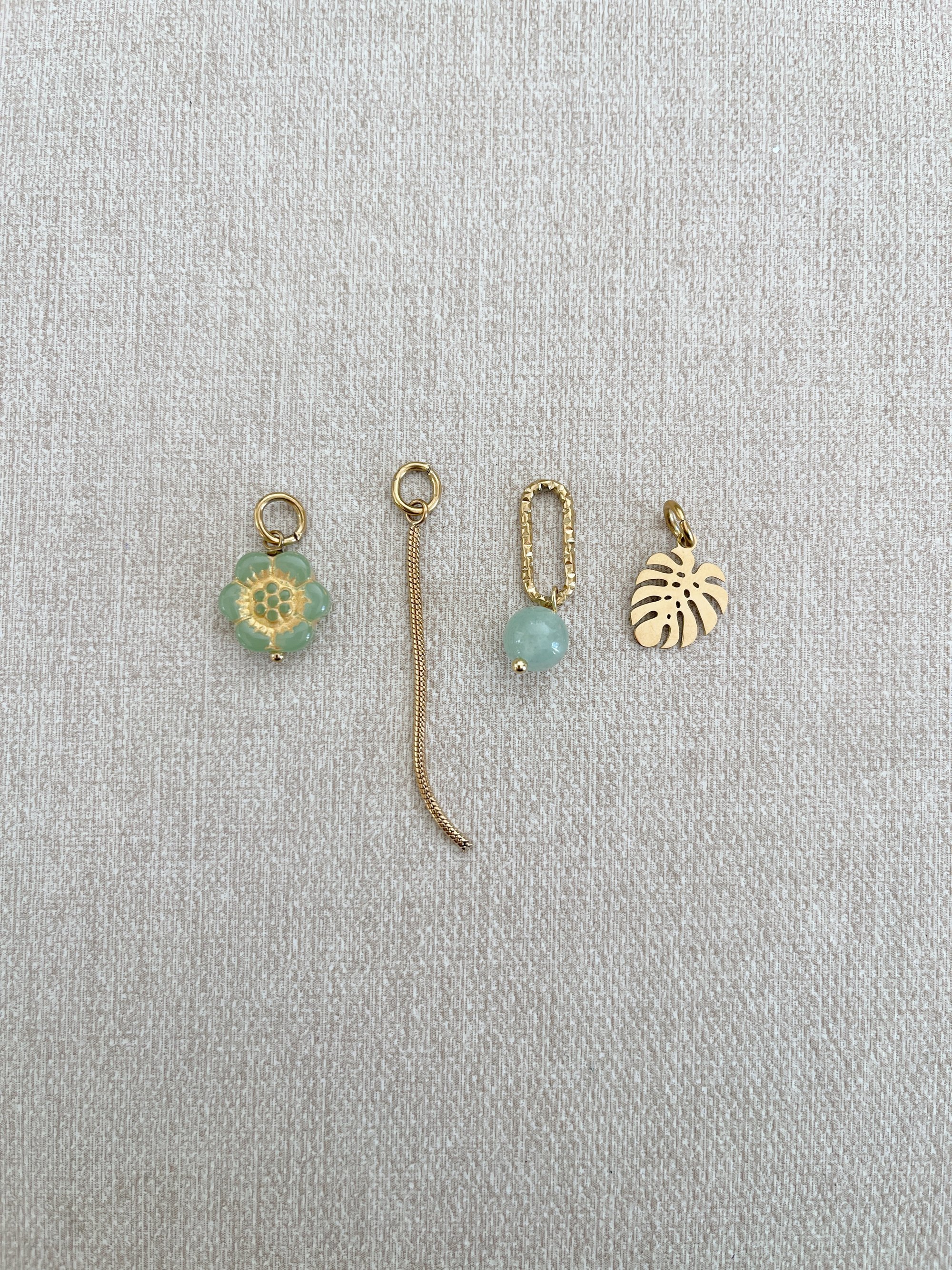 Quatre CHARMS assortis à enfiler sur une base de créole ! Fini le casse tête, une compo toute prête dans les tons de vert clair